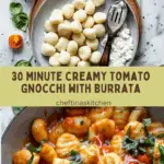 This 30 Minute Creamy Tomato Gnocchi with Burrata is a cozy, quick, and elegant dish that combines pillowy potato gnocchi with a rich, garlicky tomato cream sauce, finished with creamy burrata and fresh basil. It’s perfect for weeknight dinners or entertaining guests.