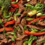 This quick and easy 30-Minute Steak Stir Fry features tender strips of beef cooked to perfection with crisp vegetables and a flavorful soy-ginger marinade. Perfect for a satisfying weeknight dinner, this recipe combines fresh bell peppers, broccoli, onions, and green onions, all stir-fried together to create a delicious and colorful dish that pairs wonderfully with rice or noodles.