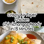 Preheat your air fryer to 350 degrees Fahrenheit. Place the rolled chimichangas seam-side down in the air fryer basket, then lightly spray them with cooking spray so they crisp up nicely. Air fry for 10 minutes until the tortillas are golden brown and crisp, and the filling is heated through.