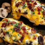 - Add Toppings and Bake: Evenly distribute the sautéed mushrooms over each chicken breast in the skillet. Sprinkle the cooked, chopped bacon over the mushrooms and then top with the shredded Colby-Jack cheese. Transfer the skillet to the preheated oven and bake for approximately 10 minutes, or until the cheese is melted and the internal temperature of the chicken reaches 165°F (74°C).