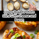 These crispy and cheesy baked potato skins make a delicious appetizer or snack. Loaded with melted cheddar and Monterey Jack cheeses, smoky bacon, and topped with fresh green onions, they’re perfect for game day or a cozy gathering. The potatoes are baked until tender, scooped, brushed with seasoned butter, and baked again to achieve crispy skins filled with gooey cheese and bacon bits.