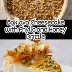 - Finish and Serve: Gently warm the honey by placing the jar or bowl inside a larger bowl of warm water for 5 to 10 minutes, stirring occasionally until it becomes loose and pourable. Trim any excess phyllo crust hanging over the pan edges for easier release, or crumble this extra crust to sprinkle over the top. Unlock and remove the springform pan sides, transfer the cheesecake to a serving platter, and garnish with additional chopped walnuts, pistachios, the remaining orange zest, and a generous drizzle of the warmed honey. Slice and serve to enjoy the perfect blend of creamy cheesecake and crunchy baklava textures.