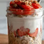 For the luscious topping, simply mix Greek yogurt, a teaspoon of honey, and optional light cream cheese until smooth and creamy. This layer brings that tangy, decadent cheesecake vibe that makes this overnight oats recipe truly irresistible.