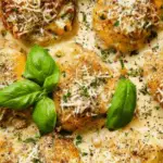 Fresh basil leaves sprinkled over the dish bring a bright, herbal note and a vibrant splash of green that visually contrasts the creamy sauce and golden chicken. For an extra cheesy indulgence, add some more pecorino-romano cheese on top just before serving.