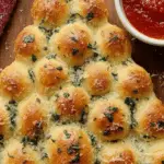 Bake the dough balls for 16 to 18 minutes until they turn a gorgeous golden brown color. While the bread is baking, melt the butter and mix in half of the grated parmesan, grated garlic, parsley, rosemary, and basil to create a fragrant, savory glaze. As soon as the bread comes out of the oven, brush this herb butter generously over the warm rolls and sprinkle the remaining parmesan cheese on top. Serve immediately with your choice of marinara sauce or pesto for dipping — it’s a flavor explosion waiting to happen!