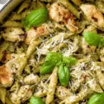 This Chicken Pesto Pasta is a quick and flavorful weeknight dinner featuring tender, seasoned chicken cooked to golden perfection, combined with al dente penne pasta and a creamy sauce made from heavy cream, parmesan cheese, sun-dried tomatoes, and vibrant basil pesto. Finished with a touch of red pepper flakes and fresh basil leaves, this dish brings an Italian-inspired flair that’s both comforting and easy to prepare in just 20 minutes.
