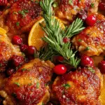 - Serve and garnish: Spoon the cooked cranberry sauce over the chicken thighs. Garnish with fresh rosemary sprigs and orange slices if desired before serving.