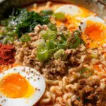 Garnish with sliced green onion, chili oil, crispy onions, and a jammy boiled egg if desired.