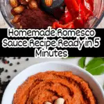 A quick and easy homemade Romesco sauce made with roasted red peppers, almonds, and sun-dried tomatoes, blended to a smooth, flavorful consistency perfect for pairing with grilled or roasted dishes.
