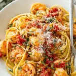 This Garlic Butter Shrimp Pasta with Tomatoes is a quick and flavorful dish perfect for a weeknight dinner. Juicy jumbo shrimp are sautéed in a rich garlic butter sauce with sweet cherry tomatoes and a hint of crushed red pepper for a subtle kick. Tossed with linguine and finished with fresh lemon juice, parsley, and Parmesan cheese, this recipe combines vibrant flavors and simple ingredients for a satisfying meal ready in just 25 minutes.