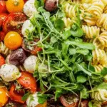 In a large bowl, toss together halved cherry tomatoes, chopped peppers, and marinated artichokes that you’ve quartered or halved. Add in the black olives, fresh arugula, and the cooled pasta. Pour in your Green Goddess dressing and toss gently so everything is evenly coated without crushing the delicate ingredients. If you have salad cress or micro herbs on hand, sprinkle them in now for extra freshness and visual appeal. Once combined, cover and chill the salad in the refrigerator for at least one hour. This resting time lets all the flavors meld beautifully, and the salad tastes even better cold!