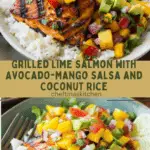 Grilled lime‑marinated salmon served with creamy coconut rice and topped with fresh avocado‑mango salsa—bright, tropical, and satisfying.