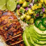 This Pineapple Chicken and Rice recipe combines tender grilled chicken marinated in zesty lime and aromatic spices with a fresh pineapple salsa and creamy avocado. Served over fluffy coconut rice, it’s a tropical-inspired dish perfect for a flavorful and satisfying meal.