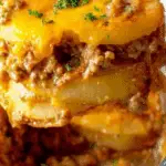 Grease a 9″x13″ baking dish with butter or non-stick spray to prevent sticking. Layer half of the sliced potatoes along the bottom to form the first layer. Spread half the ground beef sauce mixture evenly over the potatoes. Repeat with the remaining potatoes and beef mixture, creating beautiful layers of hearty goodness.
