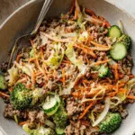 This Ground Beef Stir Fry is a quick and flavorful paleo, Whole30, and AIP-compliant meal that combines tender ground beef with a medley of fresh vegetables. Perfect for a healthy weeknight dinner, it features ginger, garlic, and a tangy dressing of coconut aminos and apple cider vinegar for a savory and slightly acidic taste that complements the crisp veggies and beef.