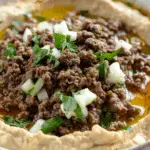 Hummus with Ground Beef is a flavorful and authentic Lebanese dish that transforms creamy hummus into a hearty meal. Topped with spiced ground beef and toasted pine nuts, it’s a savory, protein-packed option that’s perfect served with warm pita or crispy chips.
