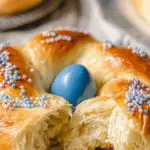 Italian Easter Bread is a traditional sweet, braided bread enriched with eggs, butter, and citrus zest, decorated with colorful dyed eggs and sprinkles to celebrate the festive season. This soft, slightly sweet bread has a tender crumb and a beautiful presentation, perfect for festive gatherings.