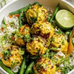 Divide the bright coconut rice and veggies among your bowls, then top each serving generously with the warm Jalapeño Coconut Curry Chicken Meatballs. Drizzle the golden curry sauce over the top and garnish with fresh lime wedges, chopped cilantro, julienned basil, and the green parts of the sliced green onions. The colors, textures, and flavors come alive here, making each bite irresistible.