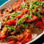 Mother-in-Law’s Chinese Beef & Tomato Stir-Fry is a quick and flavorful weeknight meal featuring tender marinated flank steak stir-fried with juicy Roma tomatoes and aromatic garlic, shallots, and ginger. Finished with a savory-sweet sauce and served alongside jasmine rice and optional fried eggs, this dish offers a perfect balance of tangy and umami flavors in just 30 minutes.