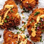 This Pretzel Crusted Chicken recipe features tender, thinly flattened chicken breasts coated in a crunchy, seasoned pretzel crust and fried to golden perfection. Served with a rich and creamy sharp cheddar mustard sauce and garnished with fresh parsley and red onion, this dish offers a perfect balance of savory flavors and textures. Ready in just 25 minutes, it’s a flavorful twist on classic fried chicken that’s sure to please the whole family.