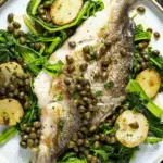 This elegant yet simple roasted baby turbot recipe pairs delicate fish with a rich caper and vermouth butter sauce. Served alongside buttery new potatoes, samphire, asparagus, sugar snap peas, and peas, it’s a vibrant and seasonal dish perfect for summer dining.