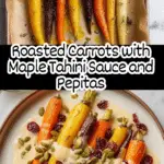 - Serve: Transfer roasted carrots to a serving plate, drizzle generously with the maple tahini sauce, then sprinkle roasted pepitas and dried cranberries over the top for added texture and sweetness.