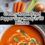 A comforting and flavorful Roasted Red Pepper Soup made with sautéed vegetables, roasted bell peppers, crushed tomatoes, and fresh herbs, blended into a smooth, creamy texture with a touch of Greek yogurt. Perfect for a cozy meal, this soup is packed with vibrant flavors and a hint of spice.