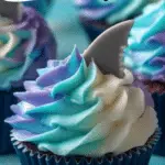 The frosting is where these cupcakes really come alive. Beat together softened cream cheese and butter until silky smooth, then gradually add sifted powdered sugar and vanilla extract. Divide the frosting into three bowls: one plain white, one bright blue, and one mixed blue and purple for a pretty gradient. Using a two-color piping bag fitted with a star tip, pipe “waves” on top of each cupcake by pushing the bag down, squeezing out some frosting, and pulling straight up. Finish your masterpiece with a shark fin cake pick poking out from each swirl. You’ve just made edible waves of fun!