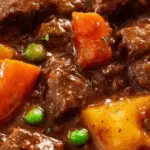 When you’re about 15 minutes from serving, stir in the frozen peas—they add bursts of fresh flavor and a pop of green. Remove the bay leaves and rosemary sprig to avoid overpowering the stew. If you prefer a thicker stew, mix ¼ cup cold water with 3 tablespoons cornstarch and slowly stir it into the pot; the stew will thicken beautifully as it stands. To finish, swirl in 2 tablespoons of cold butter for a glossy, velvety finish—a chef’s trick called Monter au Beurre that elevates the dish remarkably. For an optional boost in color, add a few drops of Gravy Master.