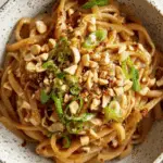 - Serve and garnish: Plate the noodles and sprinkle with crushed peanuts, chopped scallions, and extra red pepper flakes if desired. Serve immediately alongside your choice of vegetables, tofu, or protein for a complete meal.