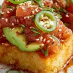 - Assemble and Serve: Top each crispy rice square with thin slices of avocado, approximately 1 tablespoon of the spicy tuna mixture, sliced jalapenos, and a sprinkle of sesame seeds. Serve immediately, optionally accompanied by soy sauce or tamari for dipping.
