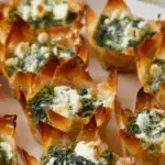 Divide the spinach mixture evenly among the prebaked wonton cups—generously stuff each one so every bite is loaded with goodness. Place the filled cups back into the oven and bake for 10 to 12 minutes, or until the filling is warm and bubbly and the wonton edges turn a gorgeous golden brown.