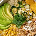 - Assemble the Bowls: In serving bowls, layer the warm cilantro lime rice or grain, then add the creamy street corn chicken mixture, followed by the zucchini and corn vegetable blend. Top with sliced avocado and romaine lettuce. Garnish with thinly sliced green onions, extra crumbled feta or queso fresco, additional street corn dip, crushed tortilla chips, and a drizzle of hot sauce. Finish with a big squeeze of lime wedge to taste.