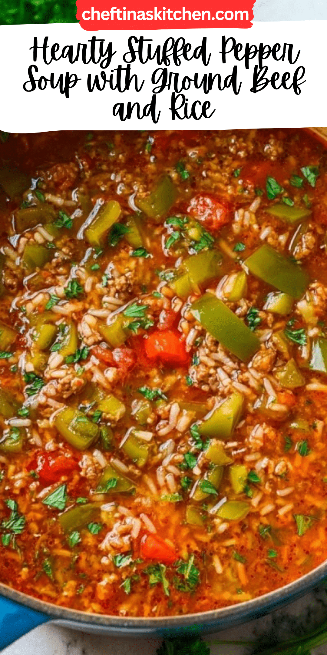 A hearty and comforting stuffed pepper soup made with ground beef, bell peppers, tomatoes, and aromatic Italian seasoning, simmered to perfection and finished with fluffy cooked rice and fresh parsley.