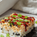 - Garnish and Serve: Remove from the oven, garnish with chopped green onions, and serve alongside nori sheets for scooping. Enjoy your delicious sushi bake!