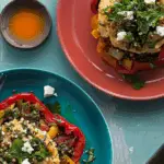 - Stuff baked peppers with tabbouleh, reserving a small amount for topping after baking.