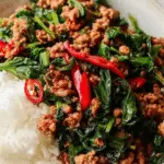 Thai Basil Chicken, or Gai Pad Krapow, is a quick and flavorful stir-fry featuring ground chicken, fresh Thai basil, and a spicy chili-garlic punch. This authentic Thai dish is perfect for an easy weeknight meal, offering a balance of savory, sweet, and aromatic flavors, served traditionally over steamed rice.