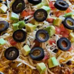 - Top with shredded lettuce, then sprinkle on Cheddar cheese, followed by tomatoes, bell pepper, and black olives.