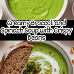 A vibrant and nourishing vegan soup combining green broccoli, spinach, and peas, enriched with creamy coconut milk, flavorful herbs, and protein-packed cannellini beans. This recipe features a smooth blended soup served with crispy air-fried beans and broccoli, garnished with dairy-free yogurt and toasted sourdough bread, making it a comforting and wholesome meal.