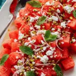 This Watermelon Salad with Feta, Pistachios, and Fresh Mint Recipe is one of those rare dishes that feels effortlessly elegant while being incredibly easy to make. It’s a celebration of fresh ingredients that come together in perfect harmony and is sure to become your go-to for warm weather gatherings or anytime you want a light, joyful feast. Give it a try and watch it disappear from the table in no time!